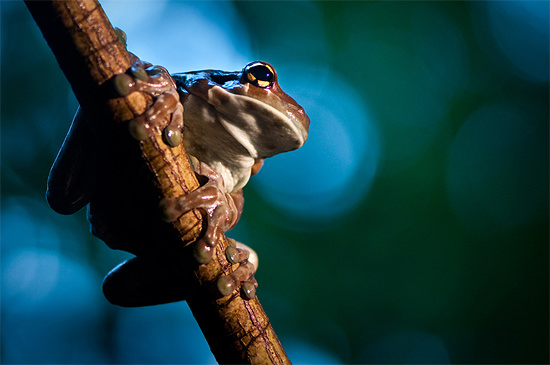 Kontrasten mellem den ”varme” frø og den kølige baggrund giver en god kontrast og tilføre billedet spænding.